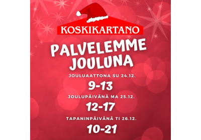 Joulun pyhinä palvelemme 21/12/2023 Hyvää ja tunnelmallista joulua kaikille! Tervetuloa kaupoille kuvan aukioloaikojen mukaisesti. Lue lisää