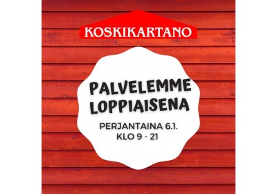 Palvelemme jouluna 23/12/2022 La 24.12. klo 8-12 | Su 25.12. klo 11-17 | Ma 26.12. klo 10-21 Lue lisää