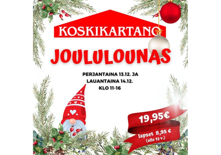 Koskikartanon suosittu joululounas pe 13.12. ja 14.12. 2/12/2024 Tästä klikkaamalla näet perinteisen joululounaan menun. Tykkää tästä Facebook Twitter Pinterest LinkedIn Tumblr