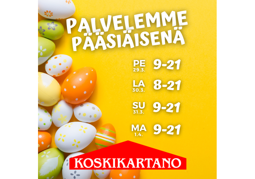 Pääsiäisen aukioloajat 25/03/2024 Pääsiäisenä palvelemme Pe 29.3. klo 9-21La 30.3. klo 8-21Su 31.3. klo 9-21Ma 1.4. klo 9-21 Hyvää Pääsiäistä! Tykkää tästä Facebook Twitter Pinterest LinkedIn Tumblr