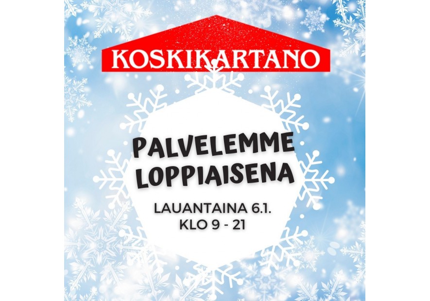 Palvelemme loppiaisena 6.1. klo 9-21 3/01/2024 Palvelemme loppiaislauantaina pyhäaukioloajan mukaisesti eli avaamme ovet klo 9. Tervetuloa! Tykkää tästä Facebook Twitter Pinterest LinkedIn Tumblr