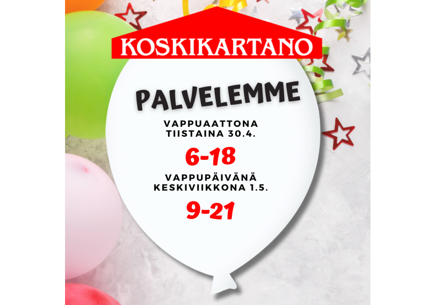 Vappuna palvelemme 29/04/2024 Vappuna palvelemme: - vappuaattona 30.4. klo 6-18 - vappupäivänä 1.5. klo 9-21 Tykkää tästä Facebook Twitter Pinterest LinkedIn Tumblr